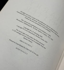 The Holy Grail of Harry Potter books, one of 500 copies. The hardcover of Philosopher's Stone saw 300 copies sent to libraries with the remaining 200 sold in book shops. This is one of the books that were sold in a bookshop.